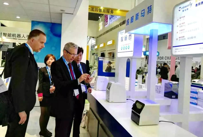 開(kāi)放式觀展設(shè)計(jì),讓現(xiàn)場(chǎng)觀眾對(duì)大型x光影像設(shè)備可以一覽無(wú)余,更加方便現(xiàn)場(chǎng)體驗(yàn),了解性能。而新上市的SMT-100V便攜式生化儀,因其小巧精致的外觀,智能化操作及凍干試劑耗材更是吸引國(guó)際友人的駐足。