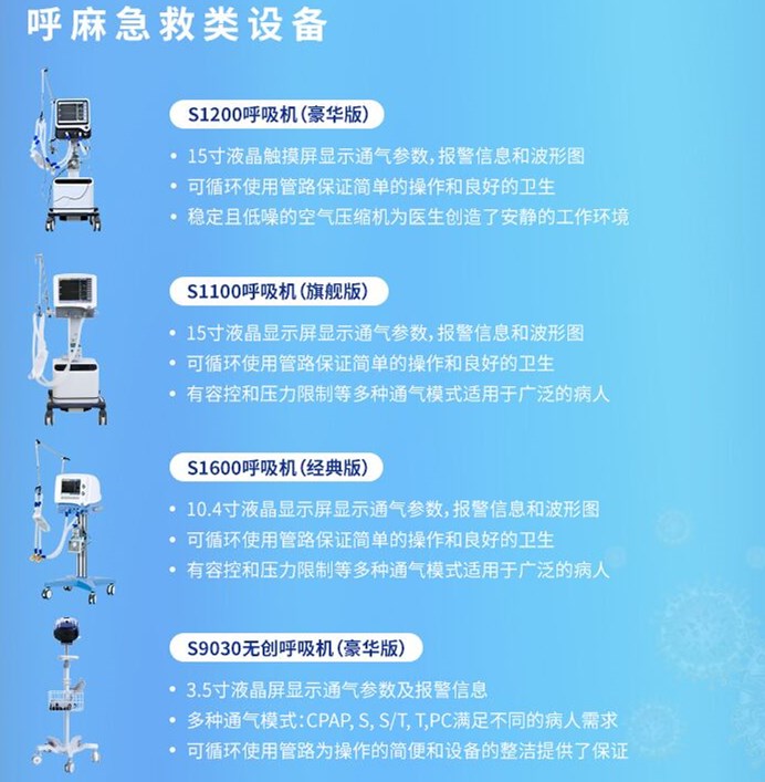 一、醫(yī)學(xué)影像設(shè)備 移動DR 動態(tài)DR 固定DR 雙立柱DR 動態(tài)DRF 二、檢驗類設(shè)備 全自動生化儀 凝血分析儀 血?dú)馍治鰞x 血?dú)怆娊赓|(zhì)分析儀 酶標(biāo)分析儀 洗板機(jī) 特定蛋白分析儀 血糖儀 三、呼麻急救類設(shè)備 有創(chuàng)呼吸機(jī) 無創(chuàng)呼吸機(jī)