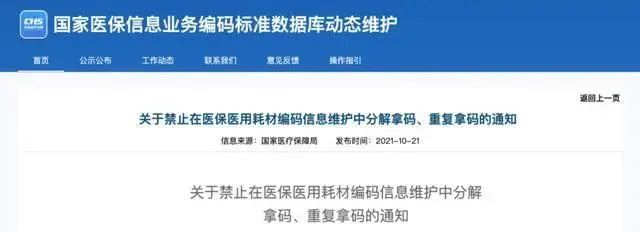 近日,醫(yī)保局發(fā)布《關(guān)于禁止在醫(yī)保醫(yī)用耗材編碼信息維護(hù)中分解拿碼、重復(fù)拿碼的通知》(以下簡稱《通知》)。內(nèi)容指出:醫(yī)用耗材維護(hù)企業(yè)需于2021年10月31日前,對已維護(hù)賦碼的耗材產(chǎn)品信息進(jìn)行梳理,對存在分解拿碼、重復(fù)拿碼情況的數(shù)據(jù)進(jìn)行合并修正、新提交。逾期未完成修正的,將停用有關(guān)產(chǎn)品編碼。