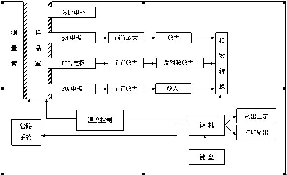 被測(cè)血液樣品在管路系統(tǒng)的抽吸下,進(jìn)入樣品室內(nèi)的測(cè)量毛細(xì)管中。測(cè)量毛細(xì)管的管壁上開有四個(gè)孔,孔內(nèi)分別插有pH、PCO2和PO2三支測(cè)量電極和一支參比電極。其中,pH和pH參比電極共同組成對(duì)pH值的測(cè)量系統(tǒng)。血液樣品進(jìn)入樣品室的測(cè)量管后,管路系統(tǒng)停止抽吸,樣品同時(shí)被四個(gè)電極所感測(cè)。電極產(chǎn)生對(duì)應(yīng)于pH、PCO2和PO2三項(xiàng)參數(shù)的電信號(hào)。這些電信號(hào)分別經(jīng)放大、模數(shù)轉(zhuǎn)換后送到微處理機(jī)。經(jīng)微機(jī)處理系統(tǒng)處理、運(yùn)算后,再分別被送到各自的顯示單元顯示或打印機(jī)打印出測(cè)量結(jié)果。測(cè)量系統(tǒng)的所有部件包括溫度控制、管道系統(tǒng)的動(dòng)作等均由微機(jī)或計(jì)算機(jī)芯片控制。