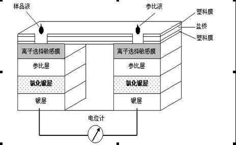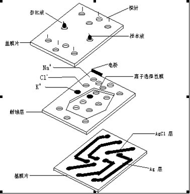 ![]() 基于ISE法的干式電解質(zhì)分析儀醫(yī)療器械結(jié)構(gòu)具有兩個多層膜片(見下圖)。多層膜片均由離子選擇性敏感膜、參比層、氯化銀層和銀層組成,并用一紙鹽橋相連。左邊為樣品電極,右邊為參比電極。測定時,用雙孔移液管取10μl血清和10μl參比液滴入兩個加樣孔內(nèi),即可測定二者的差示電位。