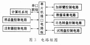 如圖的臨床生化分析儀采用一片2051單片機控制一只步進電機的方向、速度、轉動步數(shù)等,通過422差分串口總線將它們聯(lián)接到接口電路板上,接口板上的控制信號再通過單片機8051的串口與計算機的RS-232串口相聯(lián)。所有電機工作在24V直流,位置傳感器是光電傳感器。